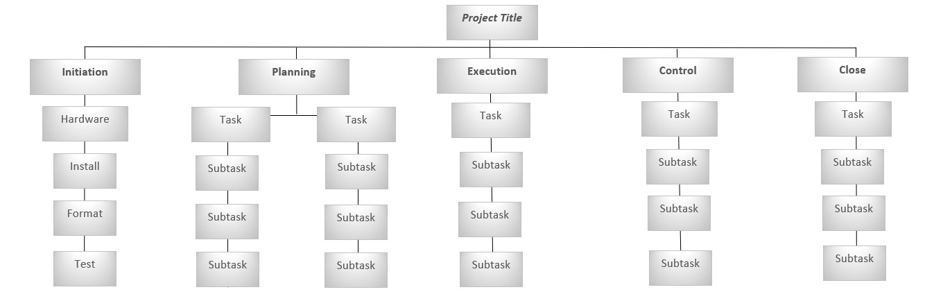 The phase-based WBS displays the final deliverable on top, with the WBS levels below showing the five phases of a project (initiation, planning, execution, control and closeout). Just as in the deliverable-based WBS, the project phases are divided into project deliverables and work packages. Our previous graphic in the “Work Breakdown Structure Example” section contained a phase-based WBS example.